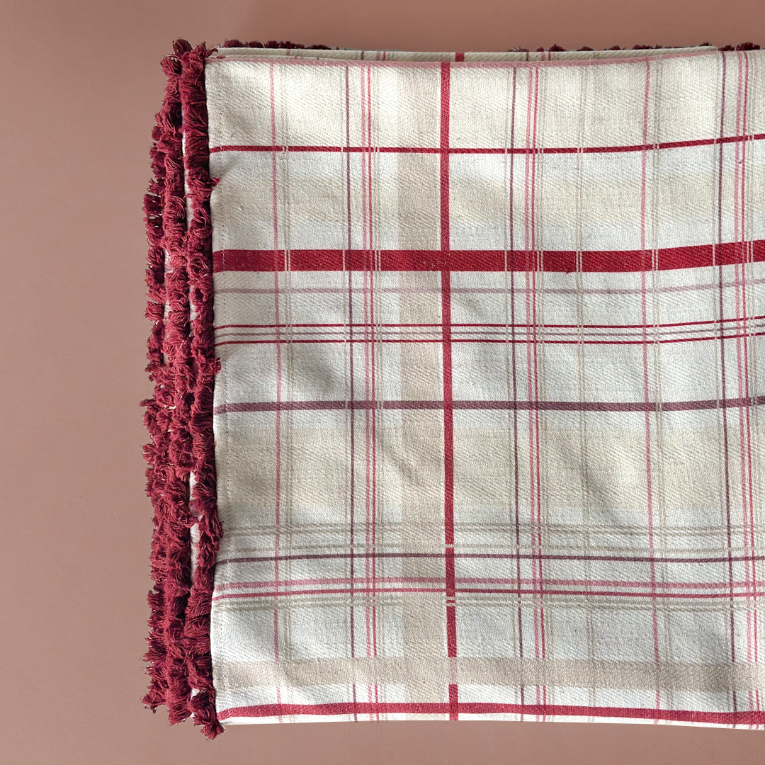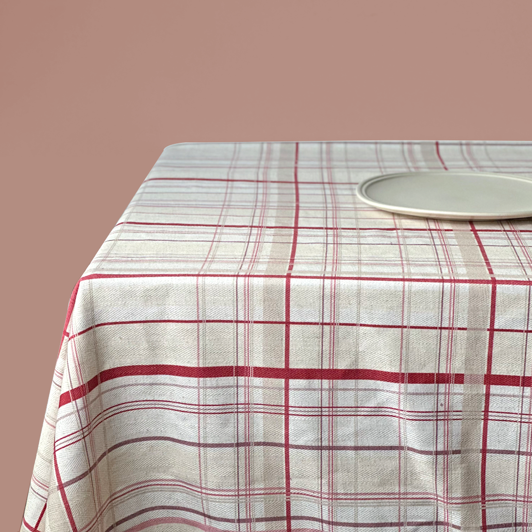 Add a cozy, rustic charm to your dining space with this elegant table cloth featuring a soft beige and red plaid pattern. Accented with rich red fringe edges, it brings a warm, textured look that’s perfect for festive gatherings, everyday dining, or seasonal décor. Crafted from a woven fabric that blends style with durability, it enhances any table with a timeless, homely touch.